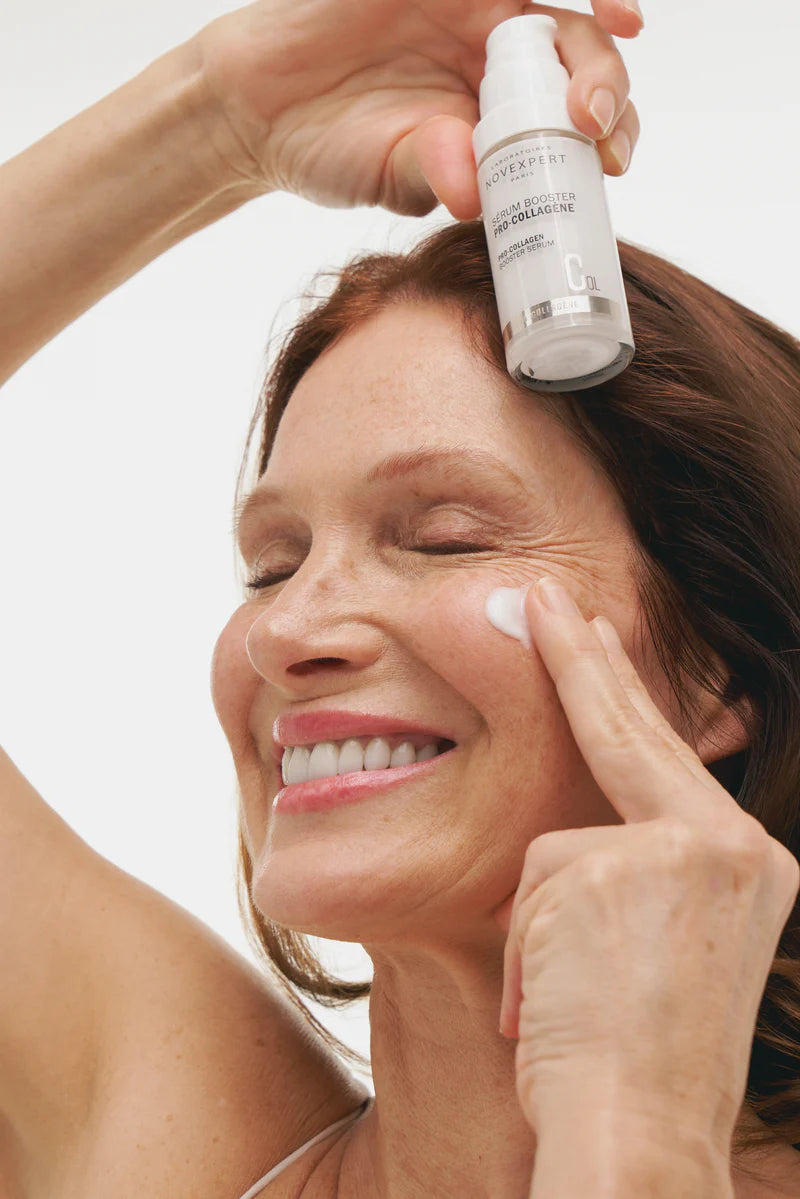 Dosez une ou deux noisettes puis répartissez le Booster Pro-Collagène sur l’ensemble du visage et du cou. Ce Booster peut s’appliquer seul ou avant votre crème. Vous pouvez vous maquiller directement après l'application du Booster.
