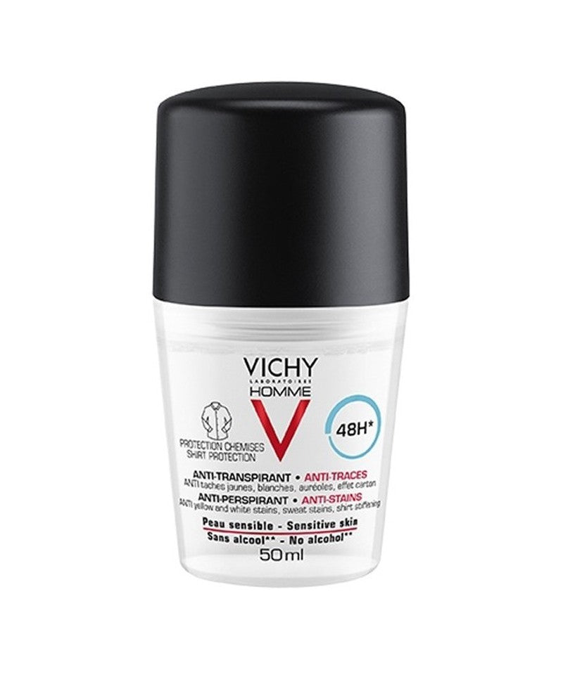 1/3 des hommes sont gênés par les traces laissés sur leurs vêtements. VICHY HOMME répond à ce besoin en créant le nouveau DEODORANT anti transpirant anti-traces protection chemise invisibles pendant 48H* offrant une efficacité ANTI-taches jaunes, blanches, auréoles, et sans effet carton.